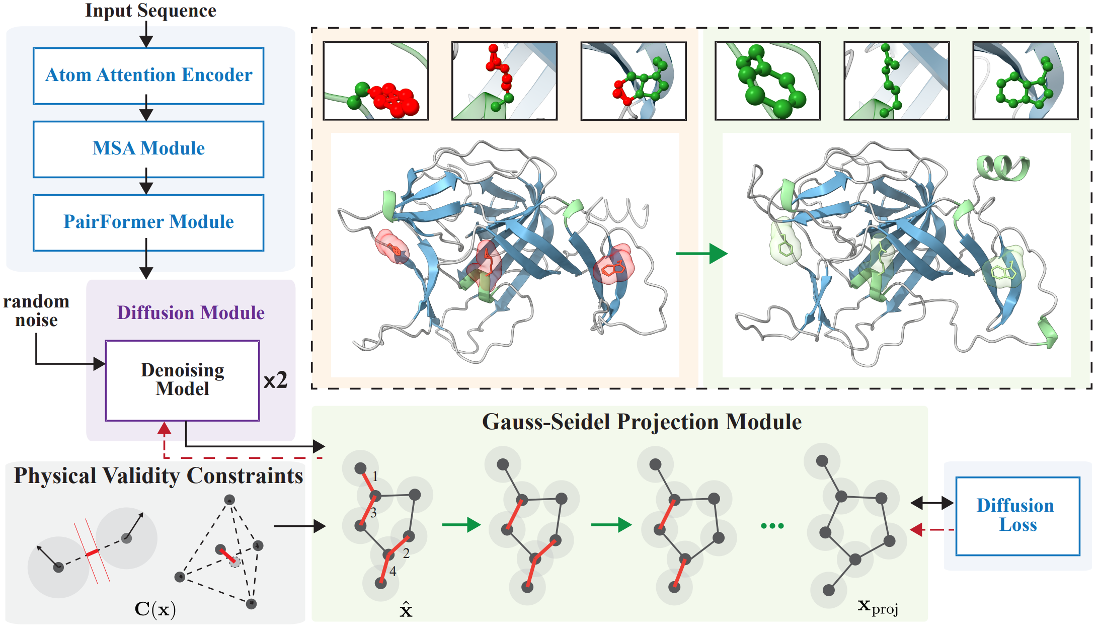 Provisional all-atom coordinates from the diffusion model are corrected by a Gauss-Seidel projection that sequentially resolves local constraints, each acting on a small set of atoms and updating coordinates in place. The module is differentiable via implicit differentiation, allowing seamless integration into training. The same projection is applied at inference, ensuring physical validity and enabling accurate predictions with as few as two denoising steps.